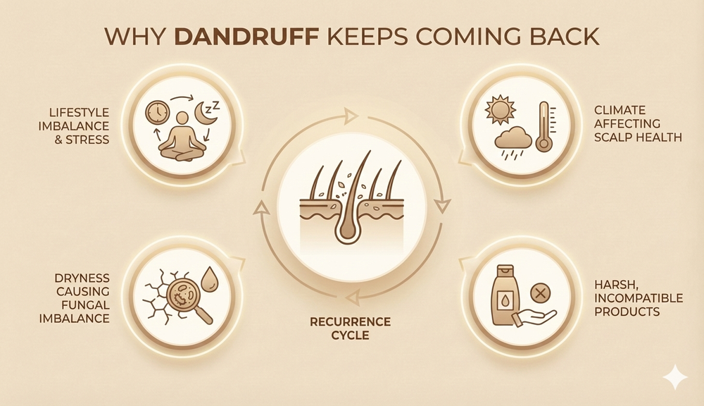 Dandruff is a scalp condition, not just a surface issue. Internal and external factors disturb scalp health, causing recurrence.