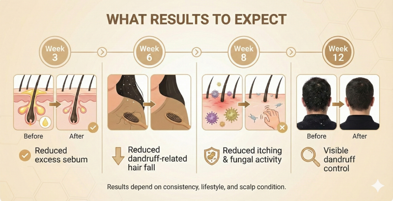 - Visible reduction in dandruff recurrence by 8–12 weeks