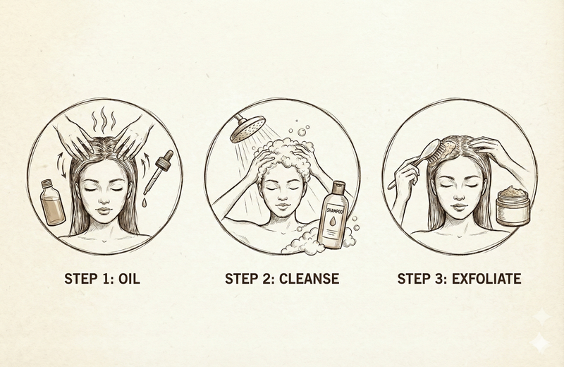 It combines scalp oiling, gentle cleansing, and optional exfoliation to heal the scalp, reduce dandruff recurrence, and support long-term scalp health.