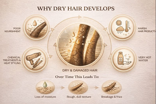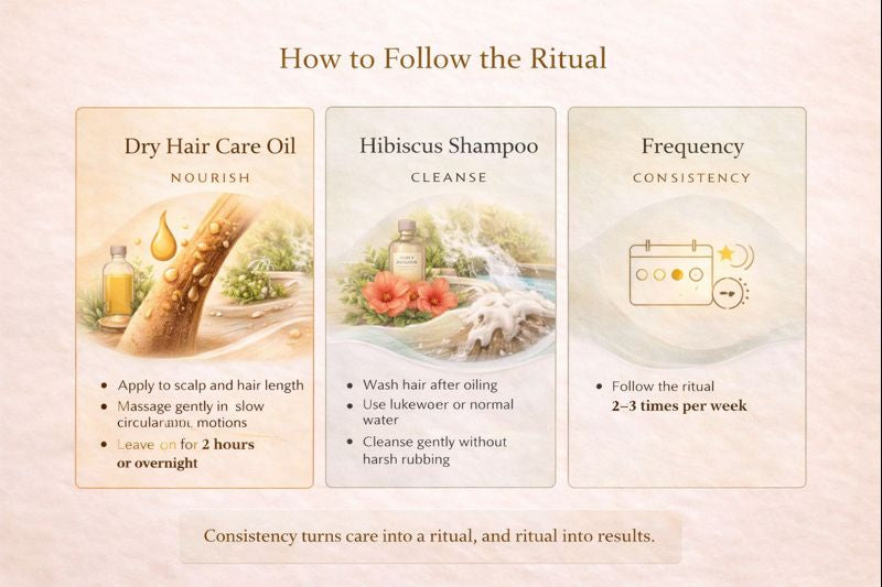 Dry hair is not just a surface problem. It develops when hair does not receive enough nourishment and is repeatedly exposed to harsh care practices. This ritual is designed to restore lost moisture, improve softness, and support healthier-looking hair through gentle, consistent care.