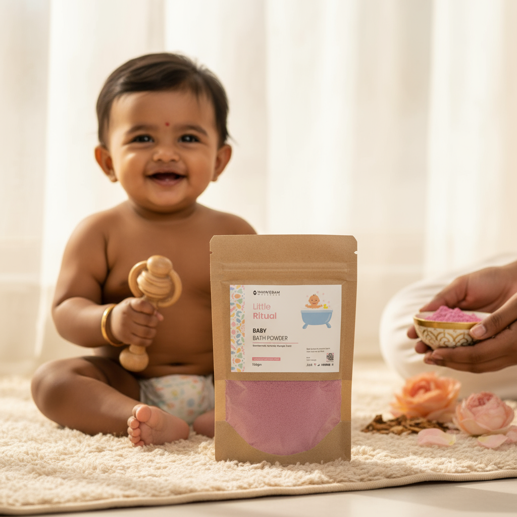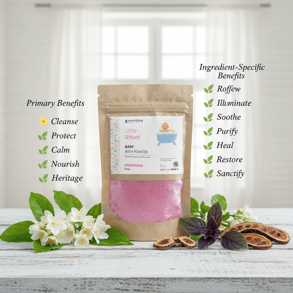 A soothing, natural cleansing powder formulated with turmeric, aloe vera, and gram flour to protect baby’s delicate skin while keeping it soft, hydrated, and glowing.
