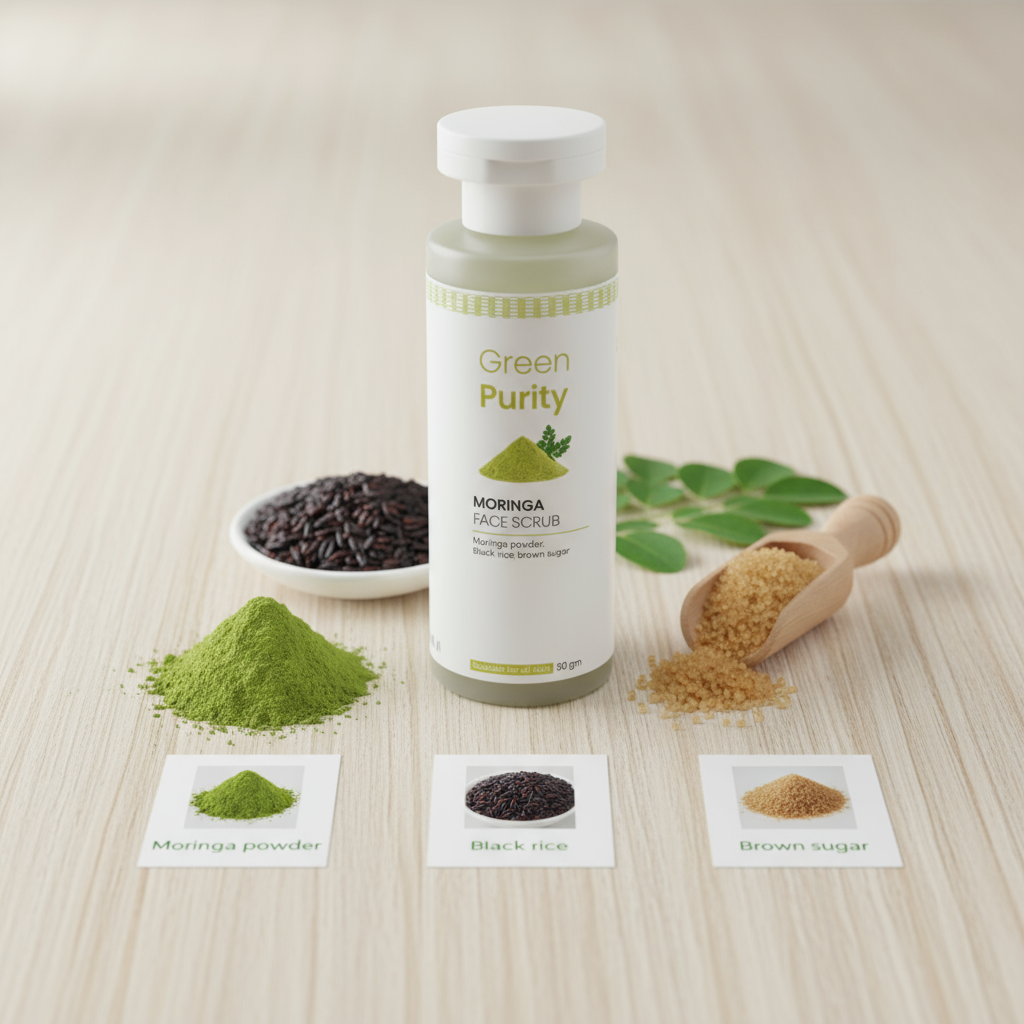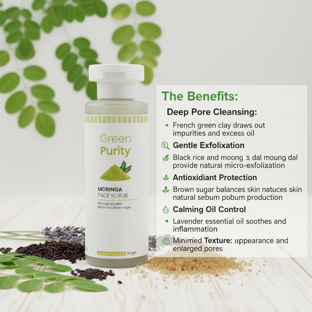 Discover the power of Moringa with our traditional face scrub, thoughtfully crafted for all skin types (except acne-prone skin). This minimalist blend combines the nutrient-rich Moringa powder with the gentle exfoliation of black rice and moong dal.