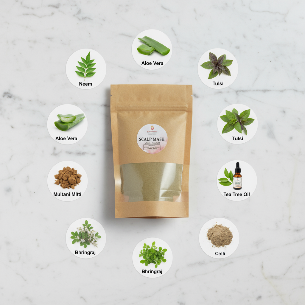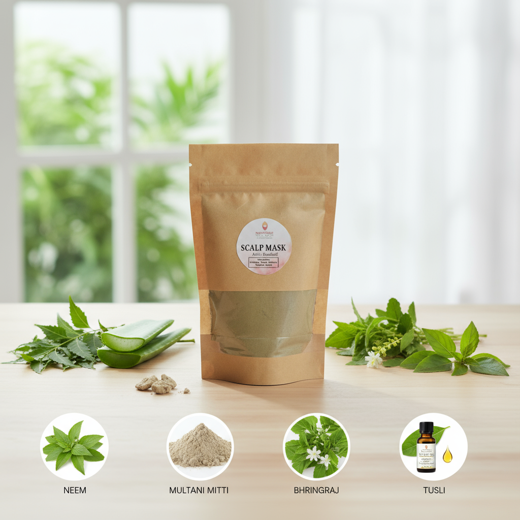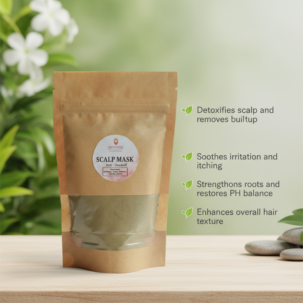 A detoxifying herbal mask that draws out impurities, reduces dandruff, and refreshes the scalp. It cools, calms, and strengthens the scalp barrier — the foundation for healthier hair.