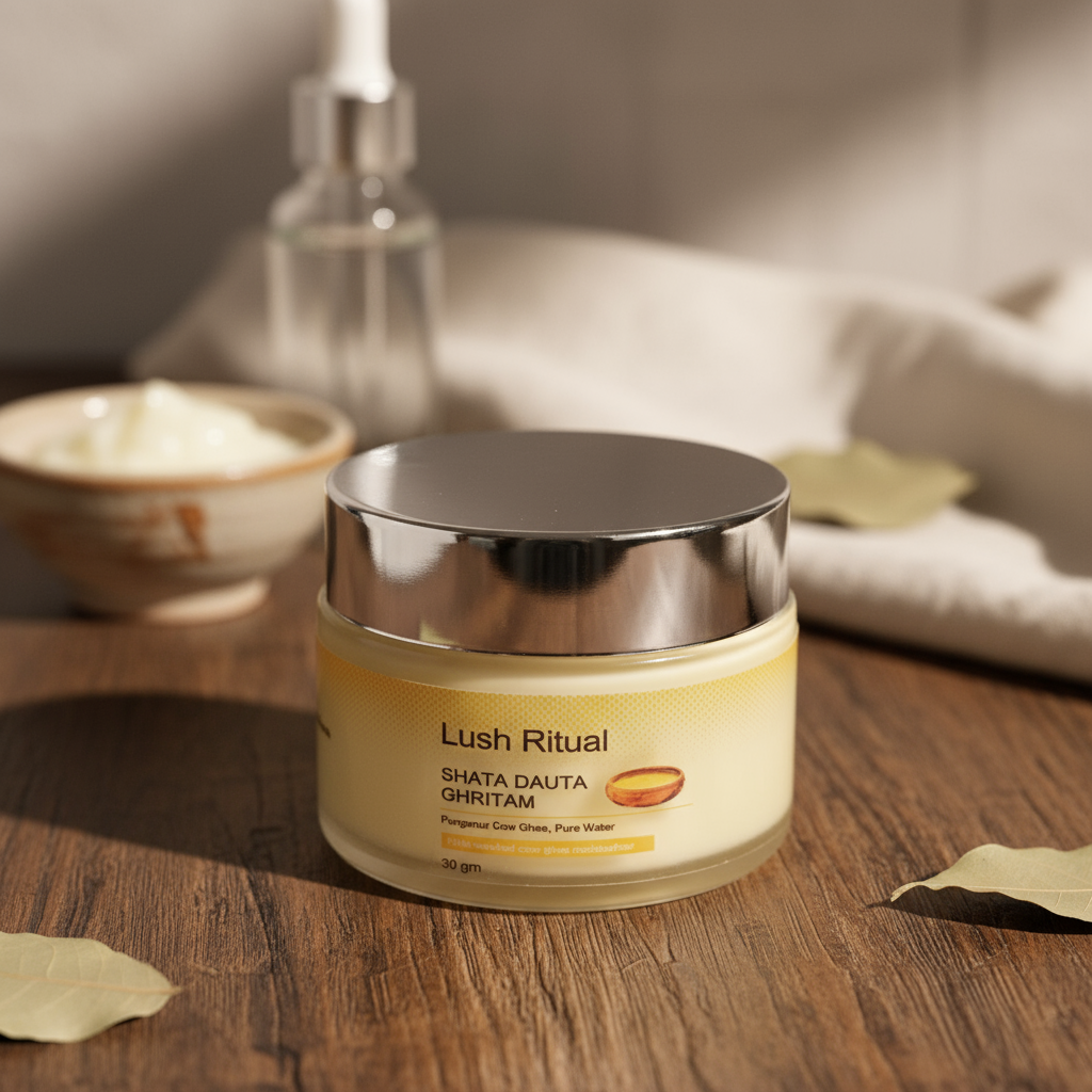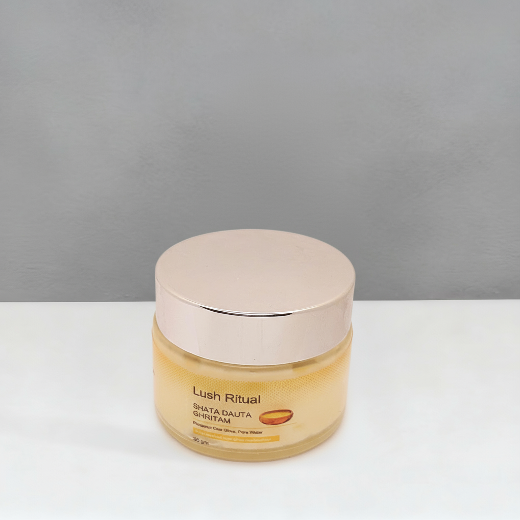 Experience the ultimate luxury of Shata Dhuta Gritam - pure ghee washed 100 times according to ancient Ayurvedic tradition. This sacred moisturizer transforms from golden ghee into a pristine, snow-white cream that delivers unparalleled nourishment and healing to your skin.